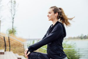 • Fit,Young,Woman,With,Earphones,Doing,Stretching,Exercises,On,Urban