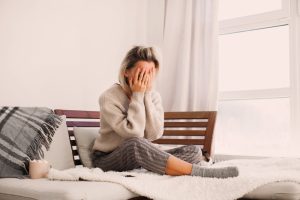 • Sad,Young,Woman,Is,Sitting,On,Bed,And,Crying,After