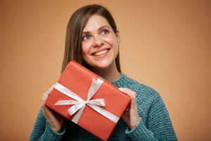 • Close,Up,Woman,Face,With,Red,Present.,Girl,Looking,Up.