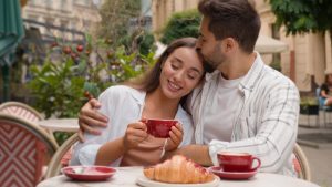 • Caucasian,Happy,Couple,Hugging,Cafe,Drinking,Coffee,Man,Woman,Sweet