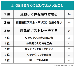 • ぐっすり眠れないあなたへ。男女500人に聞いた「快眠のために試してよかったこと」1位はコレ