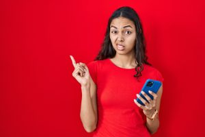 • Young,Brazilian,Woman,Using,Smartphone,Over,Red,Background,Pointing,Aside