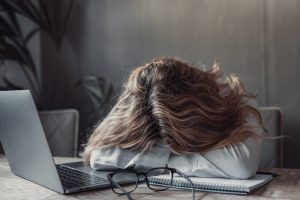 • Exhausted,Young,Caucasian,Female,Employee,Sleep,Desk,At,Office,Overwork