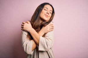• Young,Beautiful,Brunette,Woman,Wearing,Casual,Sweater,Standing,Over,Pink