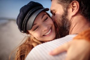• Couple,Hugging,And,Smiling,On,The,Beach,During,A,Sunny