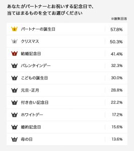 • 「パートナーと一緒に祝う記念日」ランキング♡3位「結婚記念日」、2位「クリスマス」、1位は…やっぱりコレ!