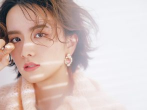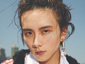 「下地に紫色を仕込んで肌の透明感を上げ、アイカラーだけでなく、チークにもパープルを取り入れたこのメイク。意外と上品ですよね。紫は色自体に気品があるので、大胆に使っても案外品のいい仕上がりになるんです。チークが強くなりすぎないよう、上からパールのハイライトをヴェールのようにかぶせたのもポイント。目元もきらりと光るラメをのせて、アメシストの持つ輝きを取り入れているのもこだわりです。ちなみにこの日身につけたアクセサリーのストーンはアメシストのもの。絵を描くときは多用するパープルですが、洋服やコスメはあまり持っていないかも…。これを機会に現実世界でも紫の世界に溺れてみようかと思います。」(板垣さん)