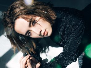「中でもイメージしたのは、磨かれる前の荒々しい紫水晶。透明感や輝きを秘めたパープルメイクに、ちょっぴり強さを感じさせる黒いコートでワイルドさを足し、石の持つ世界を表現しています。」(板垣さん)