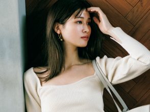色っぽさとおしゃれっぽさが両立できる、ビスチェタイプの三角ビキニ♡ 胸下がしっかりホールドされたデザインは、背中のリボンをキュッと結べばバストがきれいに盛れちゃう仕掛け。くすみカラーで大人っぽさがキープできる花柄は、ボディラインがカムフラージュできるうれしい視覚効果も。小物はゴールドアクセとラフィアの帽子で、トッピングを忘れずに。