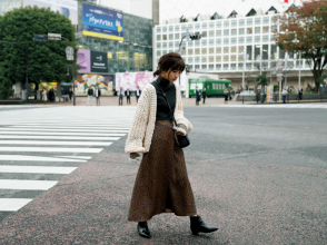 カーディガン[インナー付き]¥13,200(COCO DEAL/ココ ディール)、スカート¥9,900(リゼクシー)、バッグ¥181,500(ボナベンチュラ)、靴¥13,750(ル タロン 有楽町マルイ店<ル タロン>)、ピアス¥4,950(mimi33/サンポークリエイト)