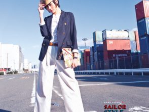 [上] ネイビーのリボンベルトが純白のドレスに映えて、インパクト絶大。