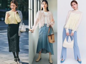 明るいイエローニットと揺れ感がロマンティックな花柄プリーツで印象的に。部分的に透ける花柄スカートは色味が淡いので、トップスに発色のいいイエローニットを合わせるとコーデの完成度が高まります!