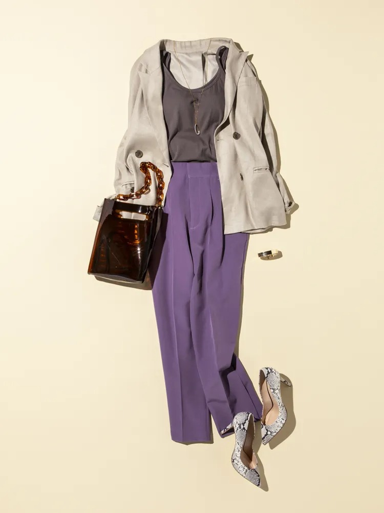 パープルのきれいめパンツは、トップスをベージュやブラウンでまとめて今っぽい配色に。黒や白を合わせるよりもこなれ感が演出できて、旬のカラーパンツを大人っぽく着こなせます。ナチュラルなリネン素材と、ブラトップのなめらかな素材も好相性♪ 女っぽい深めのUネックは、デコルテの開きにこだわるユニクロならでは。露出の少ないジャケット×パンツコーデでも華奢見えが叶います
