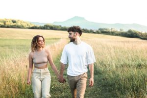 • Lovely,Heterosexual,Couple,In,A,Grass,Field,Walking,And,Kissing