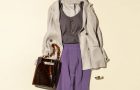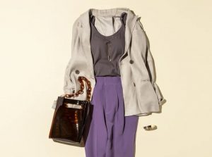パープルのきれいめパンツは、トップスをベージュやブラウンでまとめて今っぽい配色に。黒や白を合わせるよりもこなれ感が演出できて、旬のカラーパンツを大人っぽく着こなせます。ナチュラルなリネン素材と、ブラトップのなめらかな素材も好相性♪ 女っぽい深めのUネックは、デコルテの開きにこだわるユニクロならでは。露出の少ないジャケット×パンツコーデでも華奢見えが叶います
