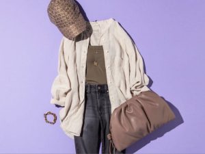 キャミソールタイプのブラトップに黒デニムを合わせた辛口カジュアル。さらっと羽織るリネンシャツは、バンドカラーを選んでラフさを演出。キャップやクラッチ、コンバースをベージュでまとめると夏らしさもキープできます。オリーブカラーのブラキャミはチラッと見えたときの洒落感も◎。下着っぽく見えないカラーなので、移動中や朝晩はシャツを羽織って、日差しの強い日中は、キャミソール1枚で着てもおしゃれ!