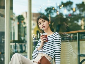 ニットの下にフリルのスタンドカラーブラウスを重ねるひと手間で、ボーダーカジュアルの着こなしが格上げ。パッと見あざやかな赤は、チノの台形ミニとコンフォートサンダルでリラクシーに仕上げるのが好バランス。