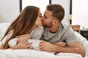 • Young,Caucasian,Couple,Smiling,Happy,And,Kissing,On,The,Bed