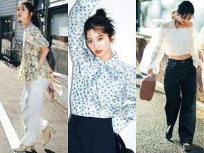 ブラウス¥10,450(SNIDEL ルミネ新宿2店<SNIDEL>)、パンツ¥9,900(サロン アダム エ ロペ/ジュン)、バッグ¥35,200(FEEL AND TASTE)、ピアス¥3,630(フィービィー)、時計¥24,200(Jouete)