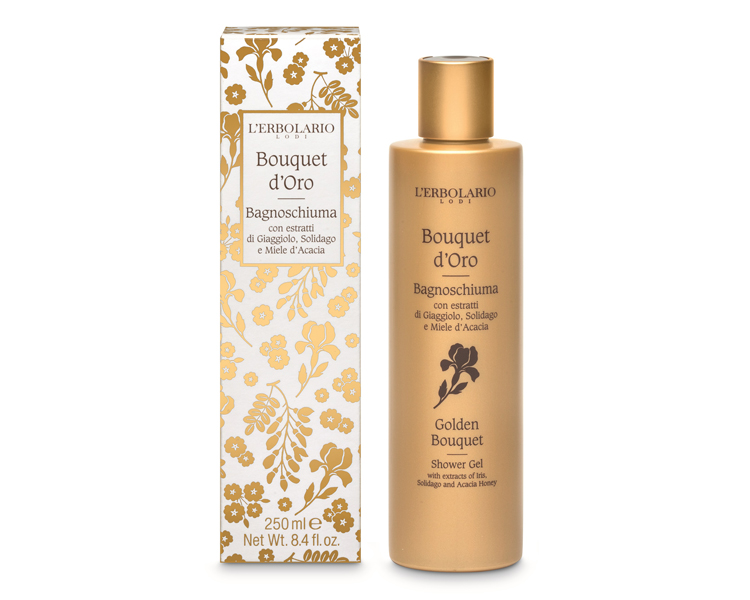 甘い香りとうるおいを届けるアカシアハチミツ、お肌をみずみずしく保つソリダゴなどゴールドの植物から得たエキス※1を配合した「ブーケドーロ」コレクションより、人気のシャワージェルとボディクリームのミニサイズ、シックなゴールドのポーチをセットにした、数量限定のコレクション。