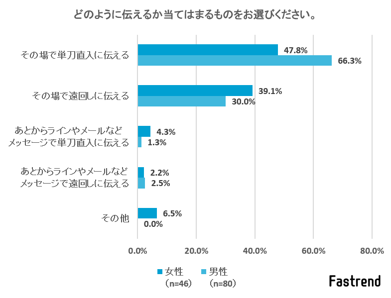 「その場で単刀直入に伝える」が、男女ともに最も多い結果となりました。「その場で遠回しに伝える」と回答した人も特に女性に多いものの、大多数があとからLINEやメールといったメッセージで伝えるのではなく、その場で直接伝えるようです。「伝えるならはっきり言う」という勇気が伝わる結果ですね。