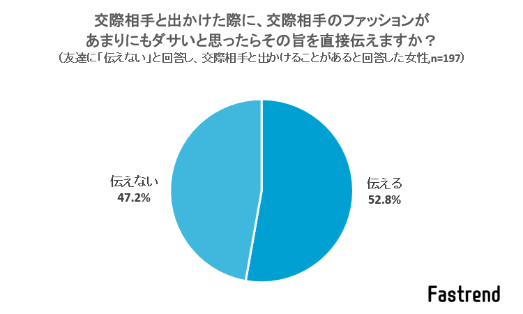 伝えない理由としては、「指摘するほど自分のファッションセンスに自信がないから」や「本人が気に入っているのであればそれでいいから」などの声が寄せられました。確かに、アドバイスできるほどのセンスが自分にあるのか不安というのは分かりますね。友達だからこそ相手の個性を尊重したいという気持ちが見えてきました。