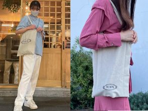「普段はミニバッグが多いのですが、iPadや資料などを持ち歩く日もあって、おしゃれで丈夫なトートを探していました。アニヤで発見したこのトートは、プラ素材(500ccのペットボトル32本を再利用!)が使われていてとにかく軽い! タブレットや重い資料を入れるので、バッグ自体が軽いことはいちばんのポイントでした。