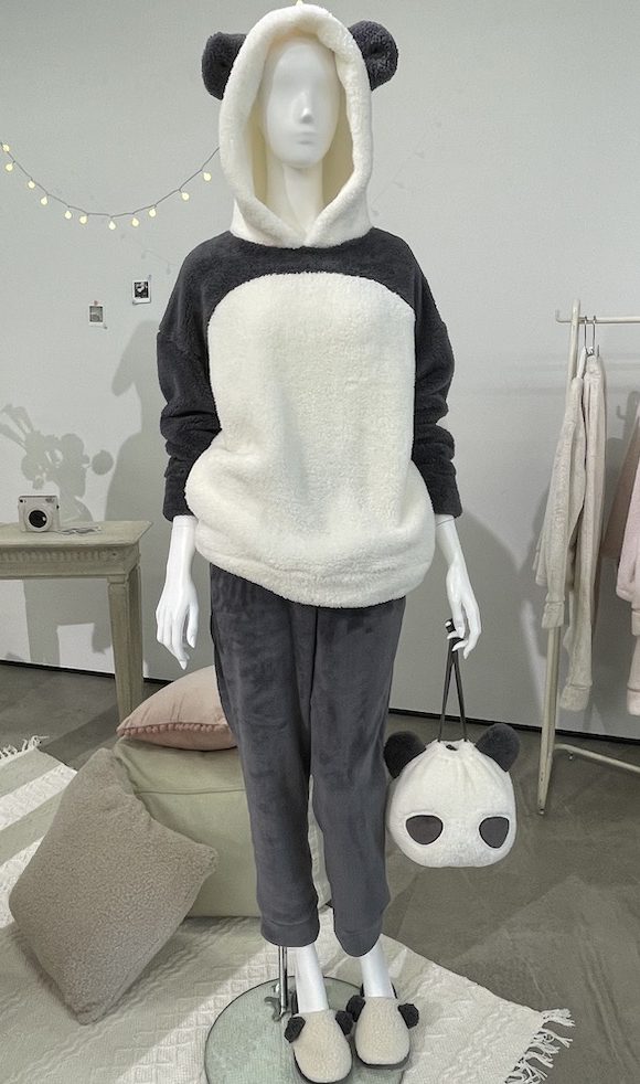 ショールームで一番最初に目に留まったのは、パンダになりきれるルームウェア。フードにパンダの耳がついていて、本当にかわいいんです!! パンダといえば、白×黒でモノトーンなイメージですが、こちらはクリーム×ネイビーで優しげムードがぷんぷん♡ 着てるだけでなんだかのんびりまったりしちゃいそうだけど…気分はパンダだから仕方ない♡