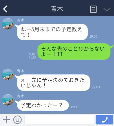 - 「そんな先の予定わからないといってるのに、すごく先の予定を決めようと毎日予定を聞いてくる(23歳・会社員)