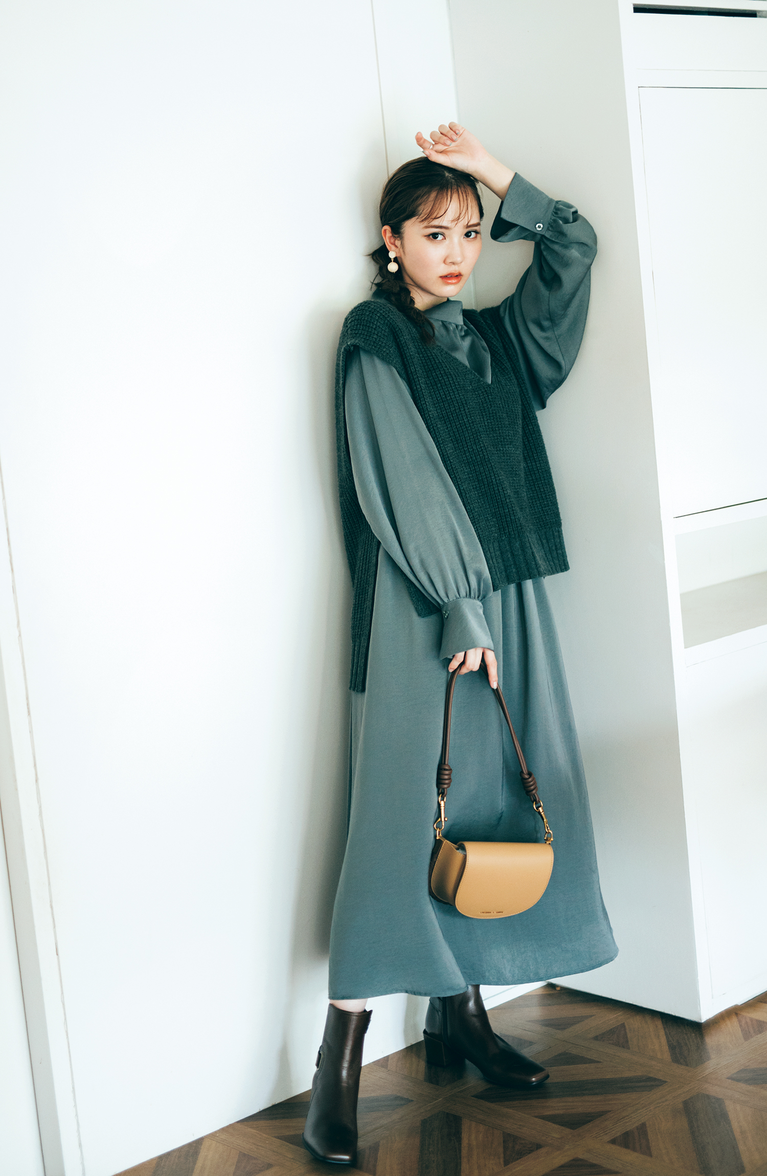 ワンピース・ベスト[セット価格]¥14,190(MURUA)、バッグ¥7,590(CHARLES & KEITH)、靴¥25,850(ダイアナ 銀座本店〈ダイアナ〉)、ピアス¥4,490(バナナ・リパブリック)、リング¥3,520(mememe)