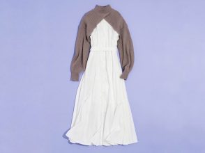 「今季はニットとシャツのレイヤードも人気のスタイリング。こちらはバンドカラーの白シャツとショート丈のハイネックニットがセットになっているので、着回しも効くし長いシーズン着られる優秀アイテム。くすみブルーのニットはゆるっと肩が落ちたデザインで、体のラインを拾わず華奢見え効果も◎。ショート丈で脚長効果を、ほどけたような縁のディテールでこなれ感もたっぷりです。