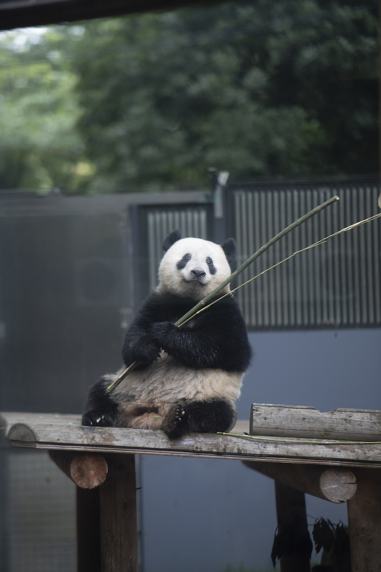 シャンシャン、この日は久々に大庭に!お庭を眺めながら、朝ごはん。しっかり手に握りしめて、食事を堪能していました!