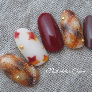ボルドー、グレージュ、ベージュ、ホワイトの4色でまとめたシンプルネイルに、ちょこっとアーガイルの遊び心を。これだけでグッとテンション上がる仕上がりに♡