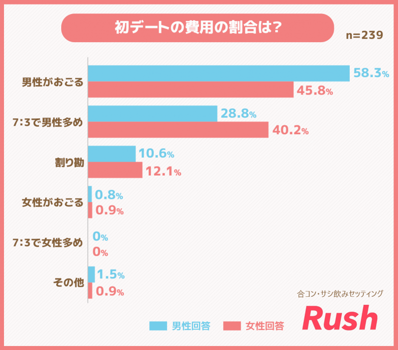 人気スポットや歩き方を見てきましたが、デート代も気になる問題のひとつですよね。ということで、ここでは「初デートの費用の割合は?」と聞いてみました。結果はこちら。