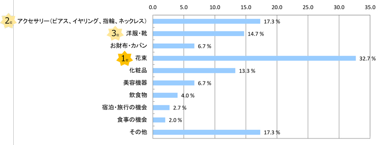 男性が今年の冬に送りたいギフトは、「アクセサリー」が堂々の第一位にランクイン! 「似合いそうだから」、「日常で付けられるから」、「身に着けてもらえるものがよい」と、女性にとって嬉しいコメントや常につけていて欲しいという愛のこもったコメントが多く見られました♪