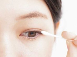 よれやすい目周りは、ファンデーションのついたパフを折った角を使ってトントンと細かく押さえて、よれをのばしてなじませます。
