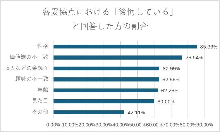パートナーとの性格の不一致は、結婚後に後悔しやすいことが判明。恋愛時代は多少いい顔をして自分を偽っている可能性もあるため、結婚前に相手の本性を冷静に見つめることがカギとなるでしょう。