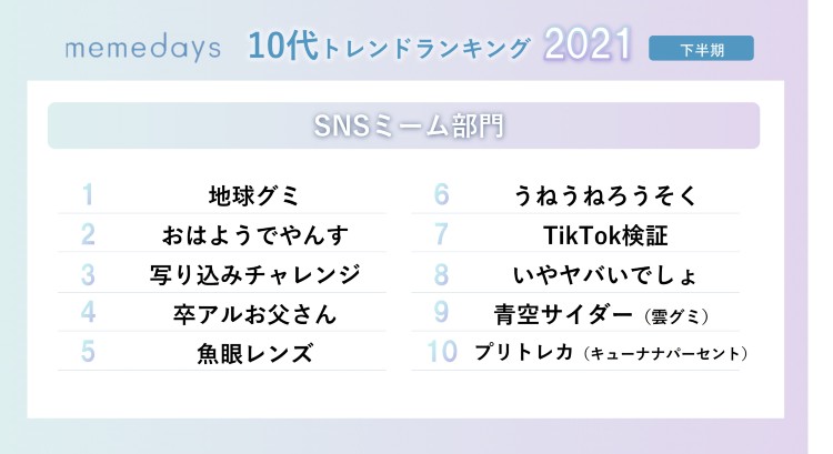 InstagramやTikTokなどで広がる投稿アイデア=「SNSミーム」のトレンドランキングでは、「地球グミ」が1位となりました。2021年上半期アイテム部門ランキングで1位でしたが、下半期はSNSへの投稿がさらに活性化!2位から4位にはTikTokで人気だった投稿ネタ「おはようでやんす」、「写り込みチャレンジ」、「卒アルお父さん」がランクイン。その他、Instagramで人気だった「青空サイダー(雲グミ)」や「プリトレカ(キューナナパーセント)」などがランクインしました!