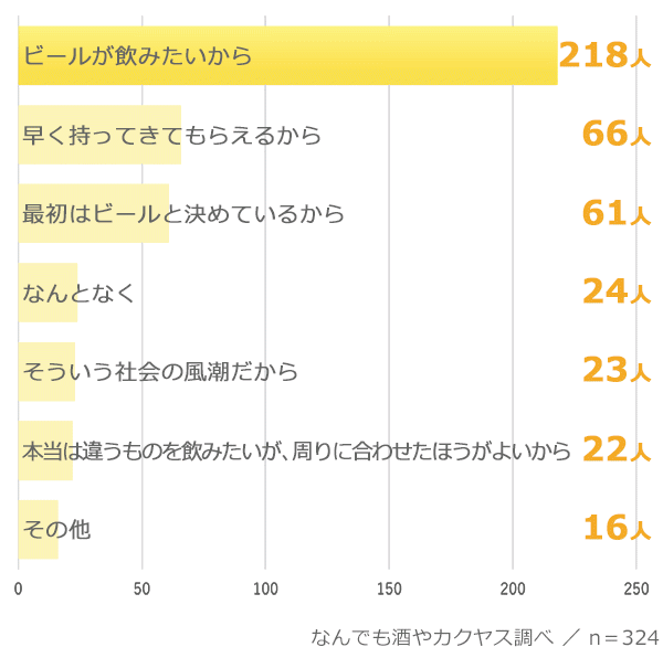 理由として圧倒的に多かったのが「周囲に合わせて」「流されて」の同調圧力ではなく、単に「ビールが飲みたいから」!次いで「早く持ってきてもらえるから」「最初はビールと決めているから」と続きます。