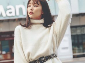 ニット・インナー付きワンピース¥19,800(SNIDEL ルミネ新宿2店<SNIDEL>)、バッグ¥40,700(ヴァジックジャパン<VASIC>)、靴¥25,300(ダイアナ 銀座本店<ダイアナ>)、手に持ったストール¥16,500(ムーンバット<マンタス エスカライ>)、ネックレス¥15,400(Jouete)、リング¥26,400(ココシュニック)