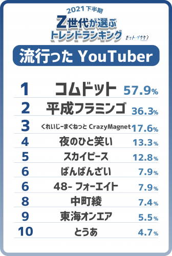 1位は「コムドット」、今や最も勢いのある5人組YouTuberがトップに! 「一切なーい」や「ピエロ」など流行語・ポーズも数多く生み出していて、 Z世代のカリスマ的存在です。