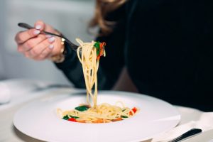 • Young,Beautiful,Woman,Eating,Pasta,In,A,Restaurant