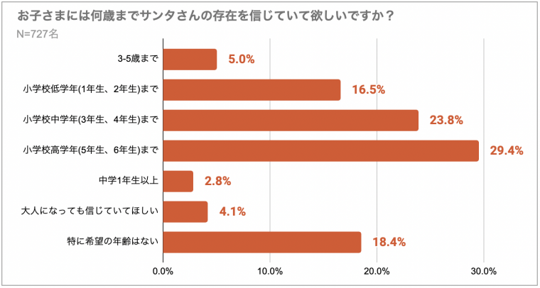 最も多かったのは「小学校高学年(5、6年生)まで」で29.4%。続いて「小学校中学年(3、4年生)」(23.8%)となりました。なかには「中学1年生以上(2.8%)」や「大人になっても信じていてほしい(4.1%)」という回答も。