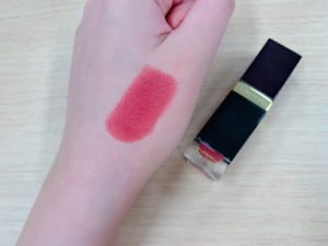よく振ってから米粒ひとつを指に取りリップの上に重ねます。塗ってからしばらくそのままにしていると、ピタッとフィットしてリップがその場に止まっている感じ。絶対にビクともしない!という頼もしい使用感です。