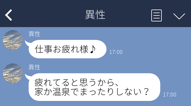 下心がないように見せる異性で、本当にない人なんていません! 家や温泉などに誘ってくる時点で、たとえ良い人だと思っていても、もう「ナシ」判定。本当に付き合いたい相手ならば、きちんとデートを重ねて、お付き合いしてから家や温泉デートに誘ってくださいね。