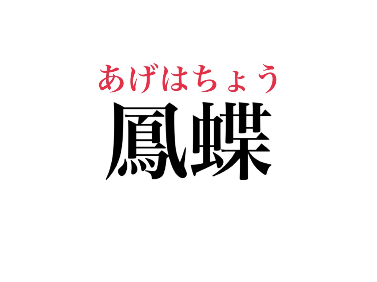 「鳳蝶」の読み方、正解は「アゲハチョウ」でした。漢字では「揚羽蝶」と書くことが多いアゲハチョウですが、このような漢字表記もあるのですね。ちなみにアゲハチョウの幼虫はゆずを好んで食べることから、柚子坊(ゆずぼう)の別名で知られています。