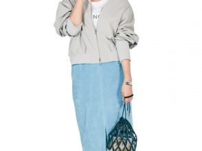 シャツレイヤードのようなドッキングニットにデニムを合わせたシンプルコーデも、今年らしいブルーグレーコートをさらっとはおればオトナきれいに仕上がる! マニッシュなロングコートは、ダークカラーでまとめないのがコツ。ざっくりとしたネックラインで、小顔効果も狙って。