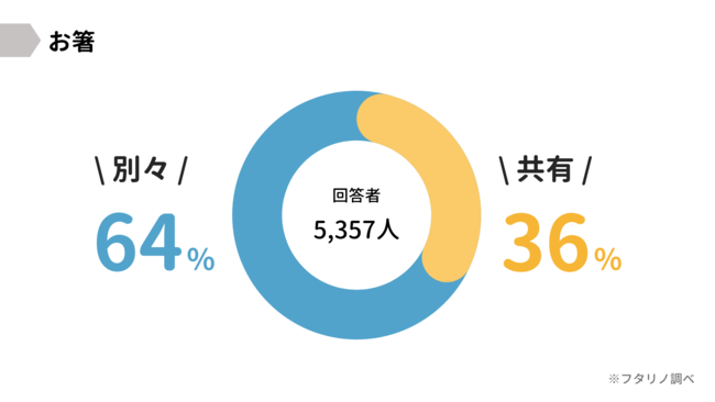 別々にしていることの方が多い日用品は、「朝一、顔を拭くタオル」「お風呂で体を洗うタオル」「お箸」「洋服」「化粧水」「部屋着」でした。体格の差が出るものや、衛生面で気になるものは別々にしていることが多いようでした。