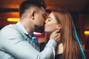 • Couple,Kissing,Sitting,On,Sofa,At,Home,At,Night.,Dating.