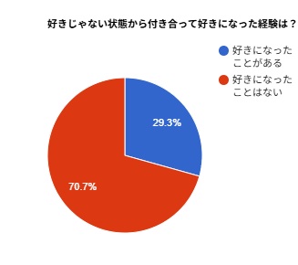 実際に好きじゃない状態から付き合って好きになった経験がある人は、およそ3割。先ほどのアンケートで「好きじゃない人と付き合うのはあり」はが3割だったので、その数値とリンクしているのかも! 好きになる可能性にかけて付き合うのも、案外なしではないかも?
